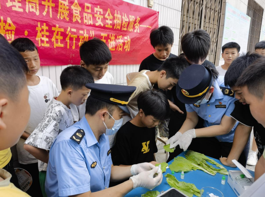 9月4日,进一步压实学校从体义务,提拔校园食物平安办理能力,正在监管人员指点下,广西壮族自治区桂林市兴安县市场监管局环绕“尚德守法 共享食安”从题,对食堂食材进行现场检测,勾当还设置有学问问答环节,接管征询180余人次,
